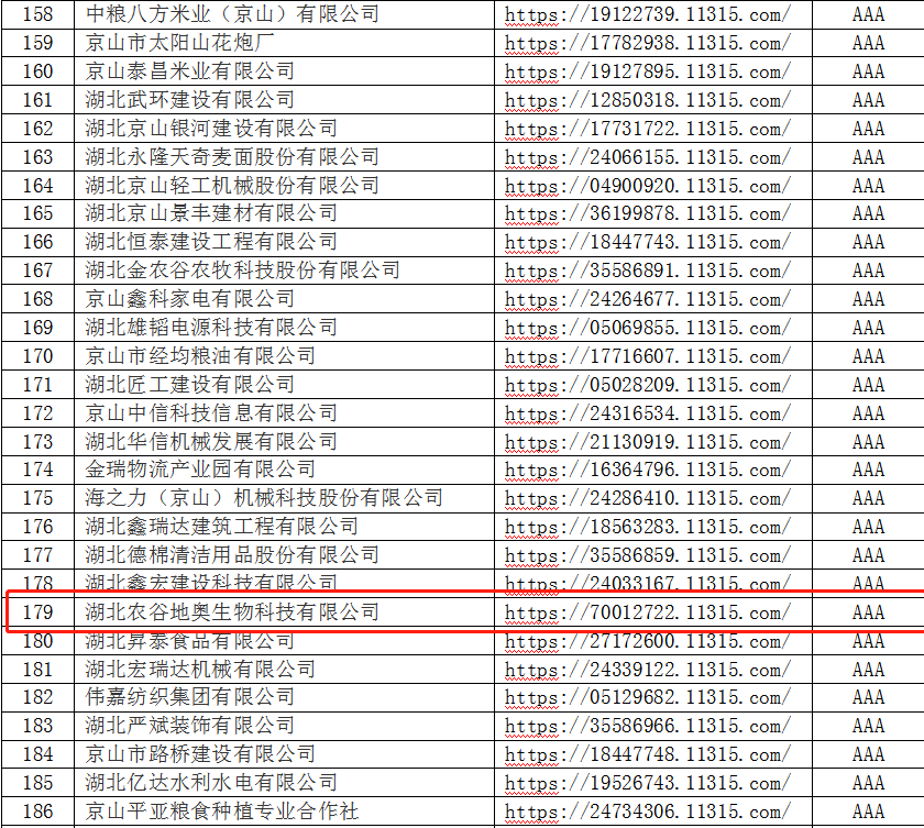 近日,从荆门市经济和信息化局获悉,荆门市以知名全国企业征信系统数据为依据,通过第三方信用服务机构认定,评选出192家2020年AAA级信用示范企业,其中京山市仅38家获此殊荣,湖北农谷地奥生物科技有限公司名列其中。
